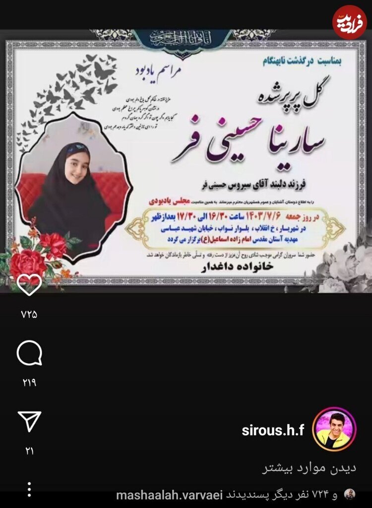 سیروس حسینی فر بازیگر نقش سیروس در سریال نون خ با انتشار تصویری در صفحه اینستاگرام خود از درگذشت ناگهانی دخترش خبر داده است. او درباره علت فوت فرزندش جزئیاتی منتشر نکرده است.