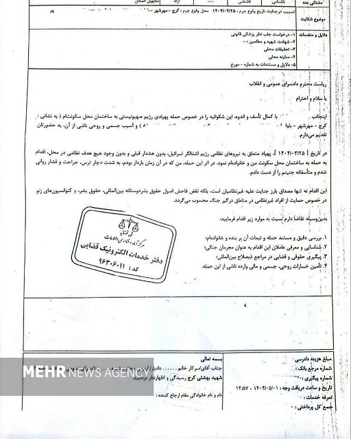 یک زن باردار ساکن مهرشهرکرج با حضور در دادسرای عمومی و انقلاب کرج، از رژیم صهیونیستی به دلیل «ایجاد رعب و وحشت عمومی» و «سقطجنین ناشی از حمله پهپادی جنگ تحمیلی» شکایت کرد.