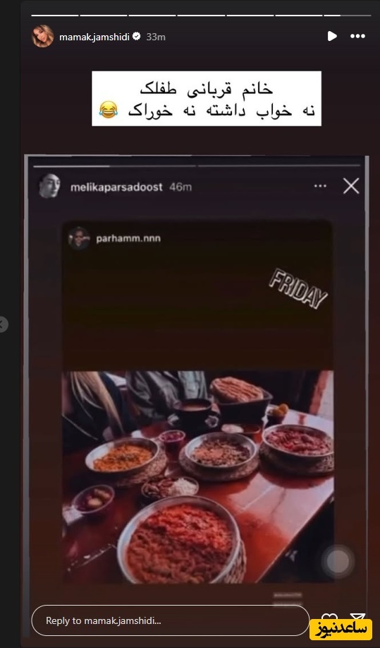 مامک جمشیدی خواهر پژمان جمشیدی چند استوری درباره شاکی پرونده منتشر کرده و در یکی از آنها نوشته است: «خانم قربانی طفلک نه خواب داشته نه خوراک».