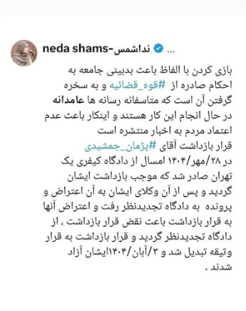 بعد از مصاحبه کامبیز برجاس وکیل پژمان جمشیدی، ندا شمس وکیل شاکی پرونده در فضای مجازی به این صحبتها واکنش نشان داد، او در این متن منتشر شده نوشته: «تاکنون هیچ رایی صادر نشده و همه منتظر دستور قاضی دادگاه کیفری هستیم.»